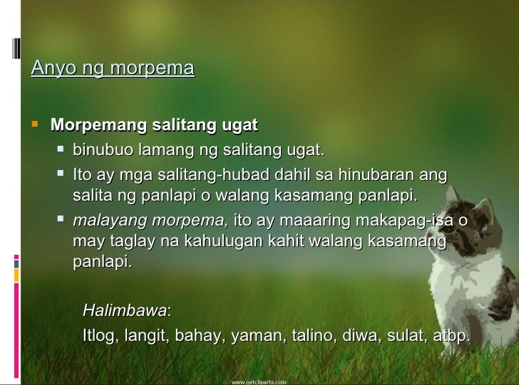 Ang morpema ay ang pinakamaliit na yunit ng isang salita na nagtataglay ng kahulugan. Hablo (ablo) 1st person, present tens (nagsasalita) b. Malayang morpema na binubuo lamang ng salitang ugat o salitang payak.